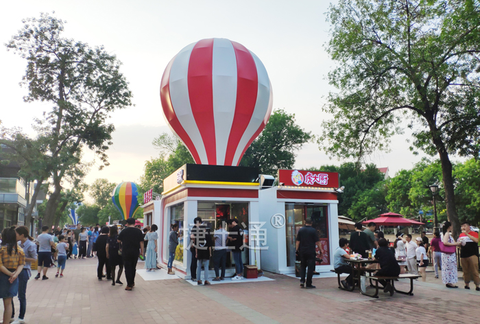 此款售貨亭 也被稱為商亭,商亭是現(xiàn)代建筑的一個(gè)詞匯,顧名思義“商”作為商業(yè)交易來(lái)應(yīng)用,亭作為一種建筑詞匯;售貨亭外型氣球造型新穎,吸引游客,從而對(duì)美食產(chǎn)生不可控之情;
