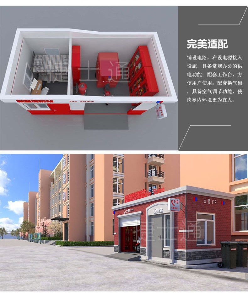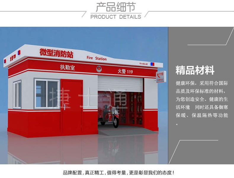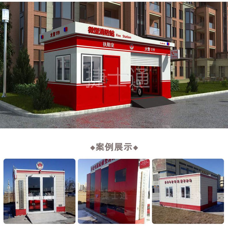 捷士通開設(shè)微型消防站產(chǎn)品線,產(chǎn)品采用輕鋼裝配,利于安放,功能具備值班室和車庫兩個功能。符合消防相關(guān)配置規(guī)定。