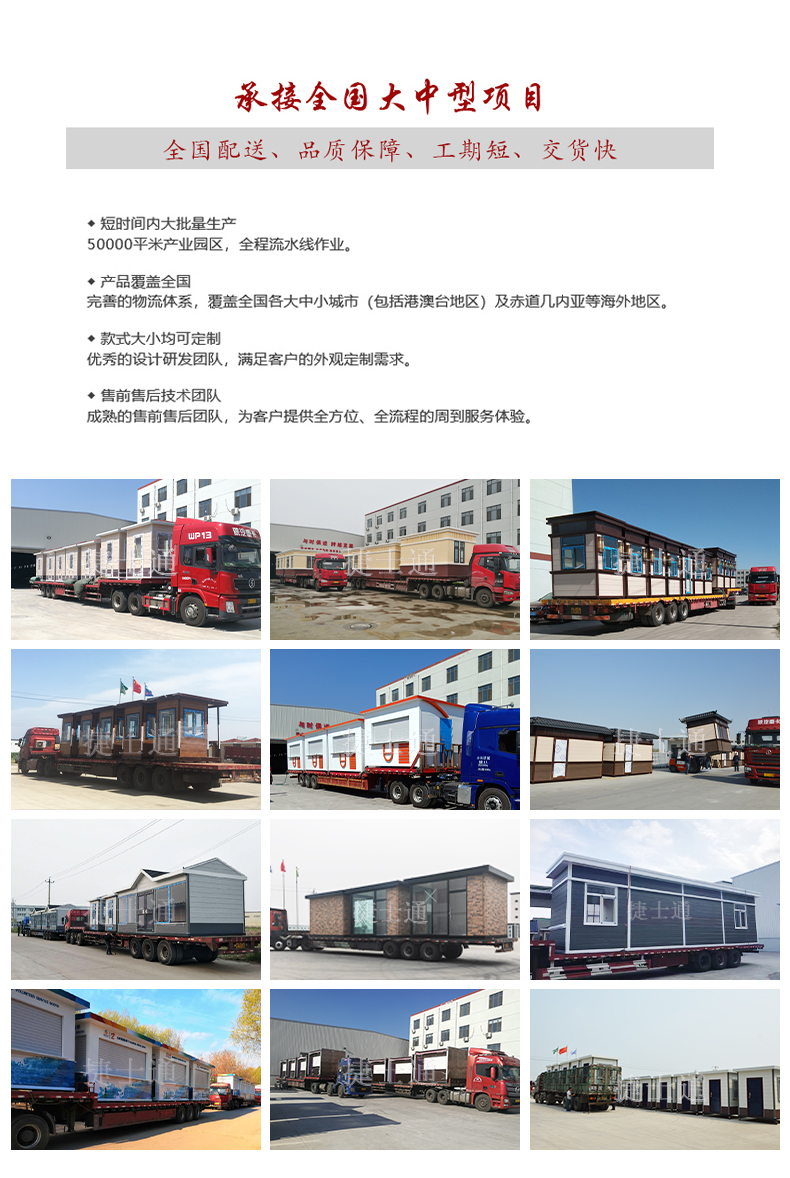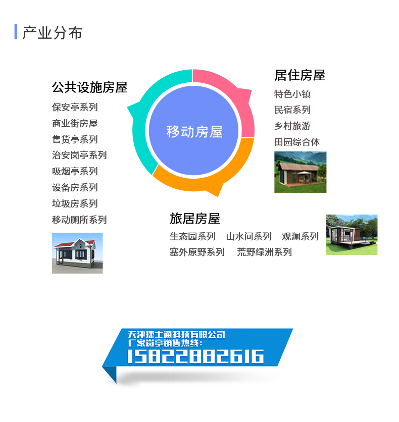 天津市捷士通科技有限公司的產(chǎn)品涵蓋了包括保安崗?fù)ぁ⑹召M崗?fù)?、志愿者服?wù)亭、城市報刊亭、移動警務(wù)室、治安崗?fù)?、吸煙亭、設(shè)備房、售賣亭、環(huán)保移動廁所、環(huán)保移動宿營房、微型消防站、森林防火檢查站、木制別墅、戶外辦公室等景區(qū)環(huán)保移動房屋系列產(chǎn)品。