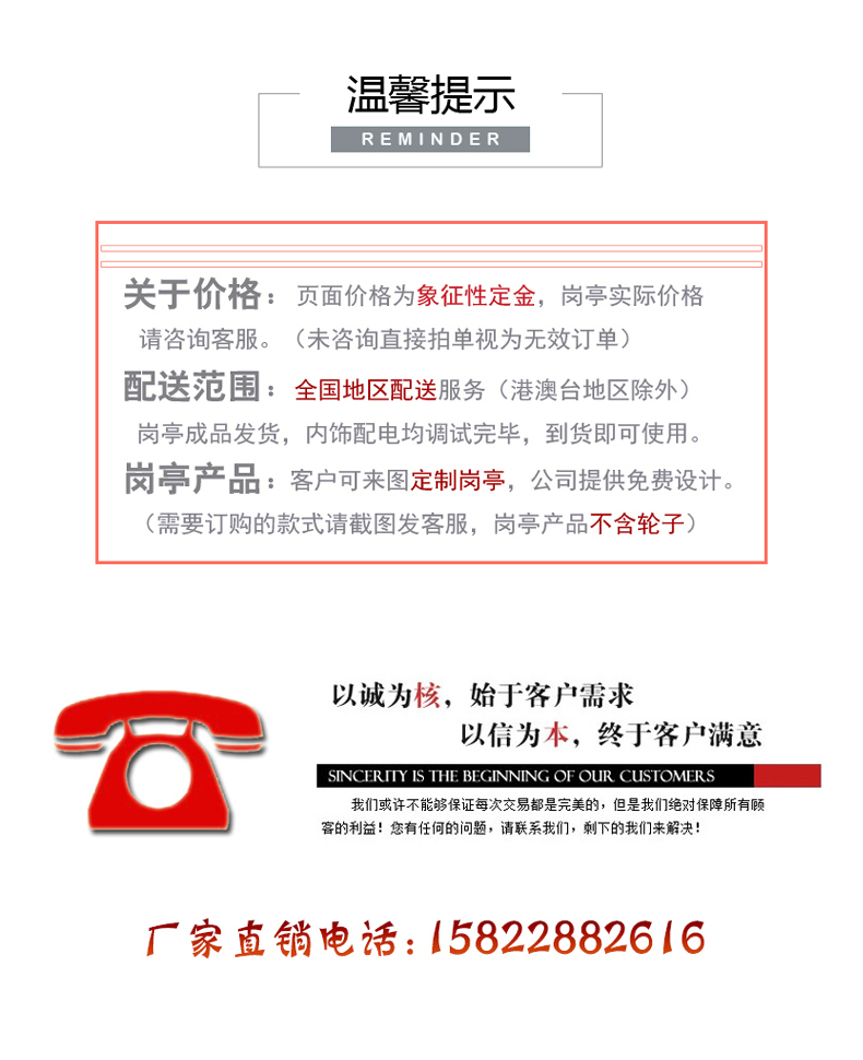 【內(nèi)吊頂】:豪華PVC扣板【外 頂】:1.2mm鍍鋅板焊接,SBS瀝青防水卷材、瀝青瓦