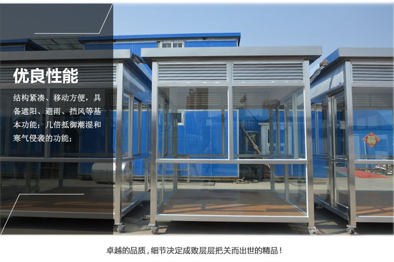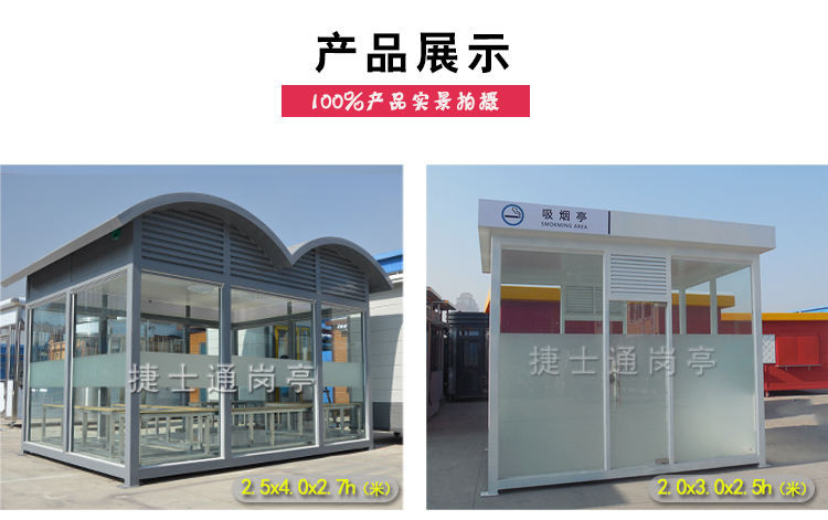 崗亭整體框架一體焊接,墻體為上下鏤空設計,選用優(yōu)質鋼化玻璃,給內部吸煙更加通透的感覺,避免壓抑,