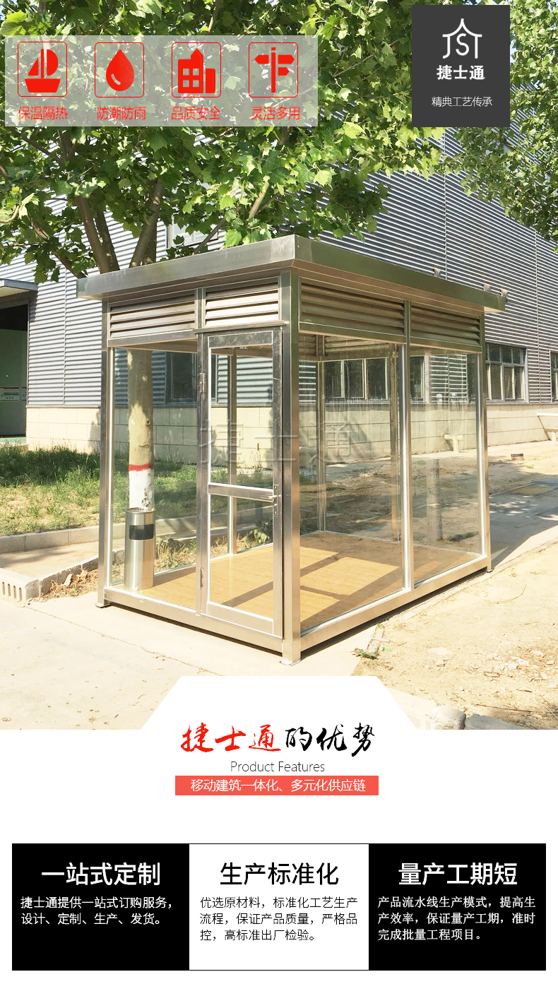 標(biāo)準(zhǔn)配置:屋頂鍍鋅板靜電噴涂,PVC吊頂,墻體玻璃材質(zhì)(鋼化、中空、有色玻璃等可定做),照明燈,漏電保護(hù)器,插座組,開關(guān),長凳,煙灰缸(如需空調(diào),排風(fēng)扇請聯(lián)系客服。咨詢電話:15822882616,公司網(wǎng)址:mapreels.com