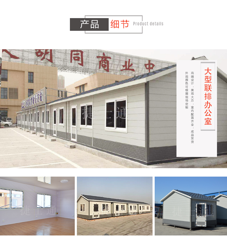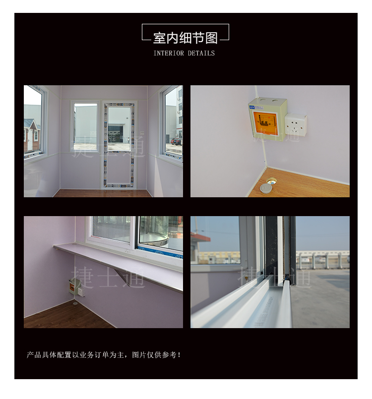 配置:整體鋼骨架焊接,屋頂鍍鋅板噴涂,外鋪彩色油氈瓦,塑鋼門窗、漏電保護(hù)器、PVC吊頂、復(fù)合木地板、照明燈、插座等。(如需空調(diào)、斷橋鋁門窗、隔間等特殊配置請(qǐng)聯(lián)系客服!)