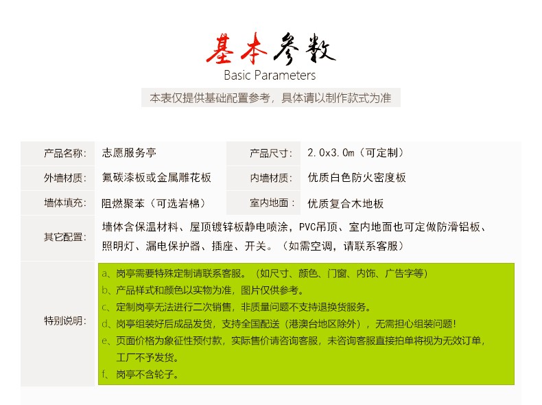 | 類型 | 志愿者服務(wù)亭 | 顏色 | 可定做 | 運(yùn)輸方式 | 公路運(yùn)輸 | ||